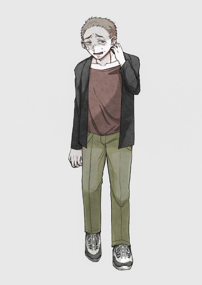 常におどおどして自身のなさげな振る舞いが目立つが、急に口汚く粗暴になることがある。エレキギターを持ちあるく。